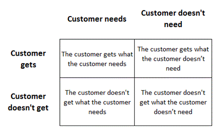 Scholtes takes his thinking further with a neat matrix that he calls the ‘needs/gets’ matrix. He provides it as a way to sort out what you are hearing from your customers. I have reproduced it below.