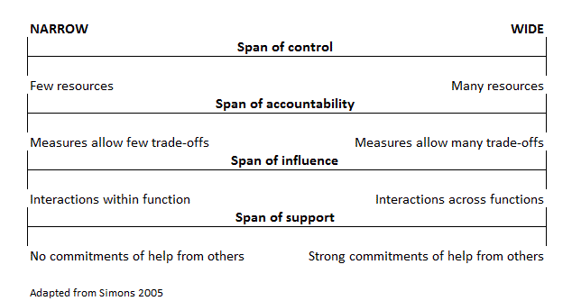 This span defines the range of resources (people, assets, budgets) for which the position has decision rights and accountability. The span of control needs to be adjusted to match the way the organisation delivers value to its customers. Simons provides some examples. In an organisation that provides value through low prices, the span is narrow and operations are characterised by standardisation and economies of scale. Managers control their function but have limited decision rights about how services are delivered, and little influence over what services are delivered. In contrast, in an organisation that needs to customise its services to suit numerous customer segments (‘local value creation’) the span of control for local managers is wide so that they can customise services in response to customer’s expectations.