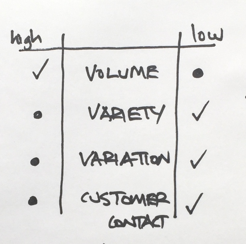 The operations typology will need to be explained (it has been the subject of a previous post). Most people understand it immediately but few have heard about it or used it in their work. It helps to understand the volume, variety, variation and intensity of customer contact characteristics of the different types of demand for each service. The demand characteristics enabling the most efficient and lowest cost operations configuration is ticked in the diagram. The demand characteristics requiring the most responsive and highest cost operations are indicated by dots. There will need to be some discussion about the demands that are a hybrid of the two types of demand.