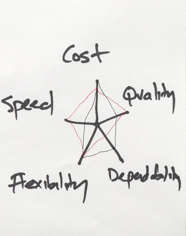 Then the performance objectives of cost, quality, dependability, flexibility and speed are then determined for each service. Again, these are likely to need explanation. Using a polar vector diagram, as shown, allows examples to be illustrated from current services. The intention is to show the comparative importance of each objective by drawing lines from each arm of the diagram to make a ‘kite’ shape, with lines starting furthest from the origin for more important objectives and closer for less importance.
