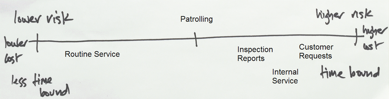 The challenge in this particular service area is to know about work in advance. A significant amount of work is generated by internal service requests (unpredictable but able to be scheduled) customer requests (unpredictable demand) and inspections (less unpredictable because inspections can be scheduled). The difference between dependent (more predictable) and independent (less predictable) demand will need to be explained, and finding ways to understand or limit the range of unpredictability could be important.