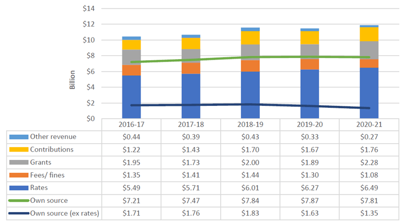 ‘Other revenue’ includes interest and the proceeds of asset disposal, for example land sales. It is not a revenue source that can easily be increased. Some councils own commercial real estate and get rent, or they own a business that provides services commercially and returns a dividend, for example a landfill. It can be difficult to get into a money-making commercial venture – ratepayers tend not to like the council investing their money.