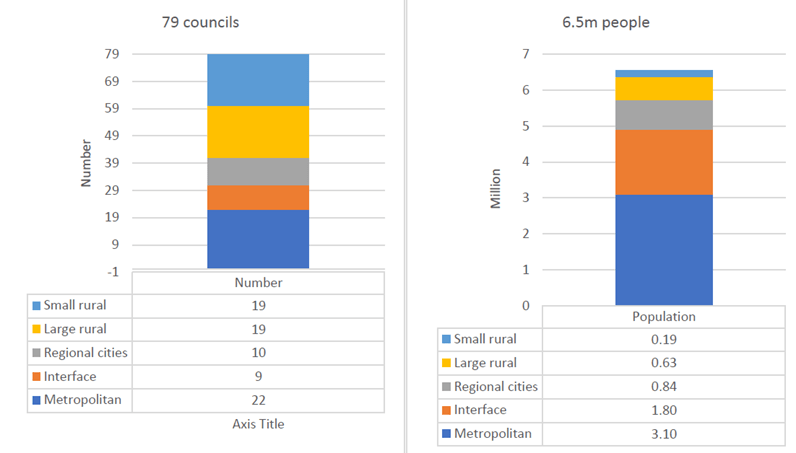 Individual councils have sought a rate cap exemption (i.e. this enables an increase to rates that is greater than the cap set by the Minister) with limited success. The criteria to be met are limited and the Minister must individually approve each application. An alternative to councils individually seeking a variation to the cap could be to change the method of calculating the cap. This could result in a cap across all councils that better reflects the actual cost increases councils are experiencing or a different rate cap for different types of councils. You can see in the graph below the differences in population (and ratepayers) across types of councils. Either approach would be fairer and require the Minister to agree.