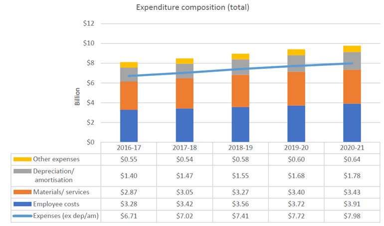As you can see in the graph above, the two main costs that councils have are employees and materials/services. Employee costs are all the usual labour related costs. Many of the services delivered by councils are labour intensive, whether that labour is provided by council employees or contractors working for the council. Materials and services expenditure also includes labour costs when contractors are engaged to provide services.