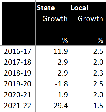 It would be interesting to calculate the average increases in actual revenues for both levels of government, with consideration of the compounding effects of the large increase by the state government in 2016/17. A similar increase for local government would have been helpful.