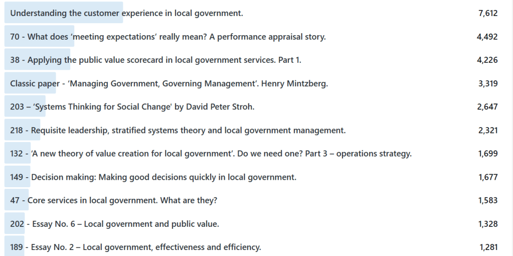 The popular topics highlight interest in customer experience, performance measurement, public value, systems thinking, service definition, and leadership in local government. Clearly, these are relevant topics for councils across the world.