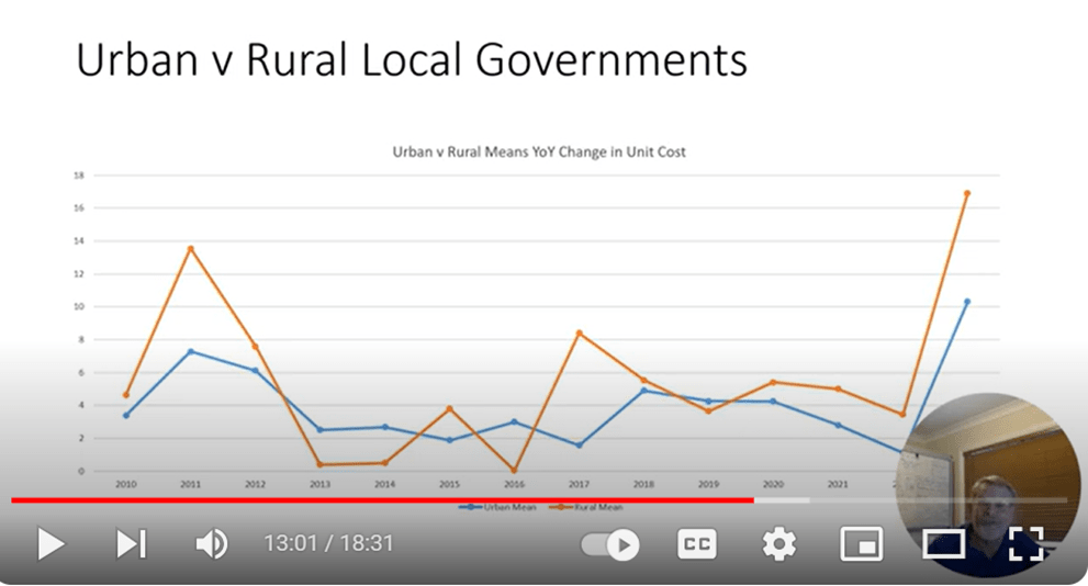 When you separate urban and rural data, a different story emerges. Rural councils have controlled labour costs and only experienced mean staff cost increases of 5.74% with a standard deviation of 7.65, and median increase of 5.24%. In comparison, urban councils experienced mean staff increases of 6.25% with a standard deviation of 8.66, and median increase of 8.66%. Urban councils, where most staff are employed, have experienced much higher rates of wages growth. Well above the approved rate cap/peg in 2022-23, which was set for each council at between 0.7% and 5.0%. Wages typically comprise 50 to 65% of council operating costs.