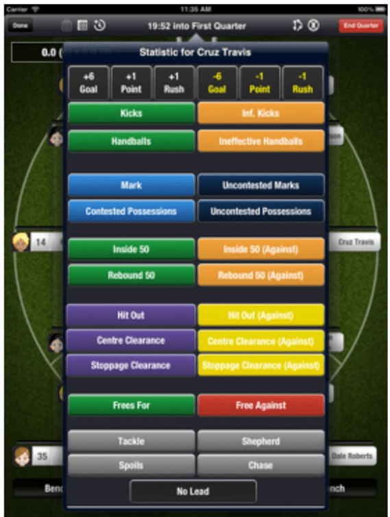 The Great Coach 2.0 software allows a club to set up a team, plan the next game, collect statistics during the game, and then report on what happened at the end of the game. While setting up your team and making sure you have the players with the range of capabilities required is important, it is the collection of stats during the game seems most relevant to councils. The image below shows the type of data collected for a player. These stats are aggregated for the team in the Coach’s Clipboard function to focus on the positives and areas to improve in the next quarter.