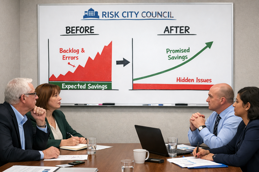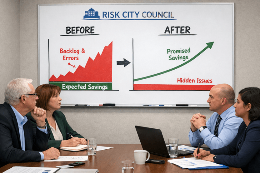 “I voted for the IT project because the business case promised the budget would balance by year four. But no one told us what we’d do if the savings didn’t arrive. In the end, we automated our inefficient services instead of fixing them. It has now cost us more money than we have saved!