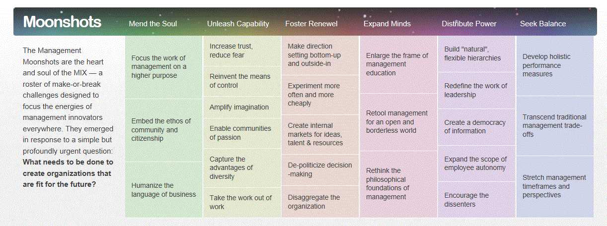 The first section links to the ‘moonshot’ themes for the Management Innovation eXchange (MIX) – an open innovation project aimed at reinventing management for the 21st century. Each ‘moonshot’ was identified by asking 35 invited participants ‘what is the management equivalent of putting a man on the moon?’ at a conference in 2008.